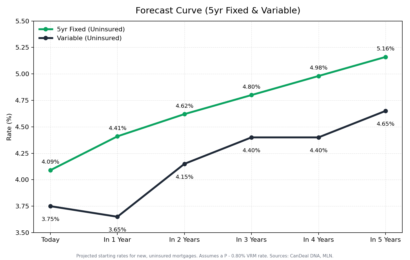 Model bias: Forecast models still favour 5-year fixed for now. The edge is modest, so choose based on penalties, portability, prepayment options, and time horizon.